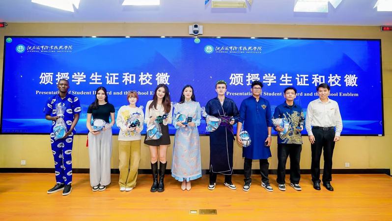 郑军为留学生开学典礼致辞。他向留学生新生表达了热烈的祝贺和真挚的欢迎,并围绕“海涵地负 德诚志远”的海院校训精神,对新生提出了三点期望:一是精进专业,勇于创新,努力成为具备国际视野的复合型人才;二是拥抱多元,增进理解,主动搭建文化交流与友谊合作的桥梁;三是严于律己、积极向上,自觉遵守法规校纪,保持健康生活习惯,尽快适应并融入新环境。郑军为留学生代表颁授了校徽和学生证,并赠送了海院吉祥物“海宝”。